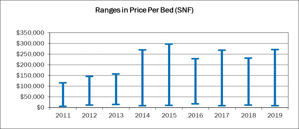 Ranges in Price per Bed (SNF), 2011-2019 This information is from the 25th Edition of The Senior Care Acquisition Report.